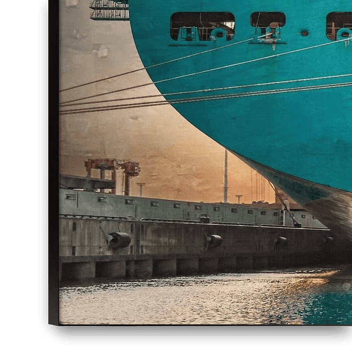 La poupe bleue d'un porte-conteneurs vide sur un quai dans le port au crépuscule, Mixed Media