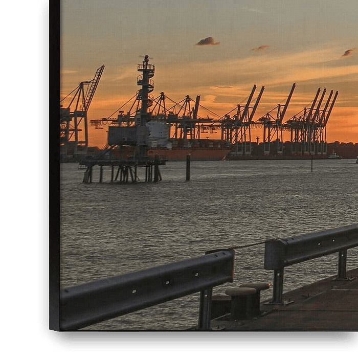 Coucher de soleil à Hambourg Altona sur l'Elbe avec une vieille grue en état de marche