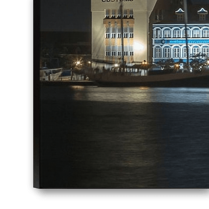 Le Handelskade à Willemstad (Curaçao) la nuit. Cette photo de nuit a été prise depuis Otrabanda avec une vitesse d'obturation longue pour que l'eau devienne magnifiquement lisse. Cela permet de mettre l'accent sur les magnifiques bâtiments de la Handelskade, qui sont également classés au patrimoine mondial de l'UNESCO.
