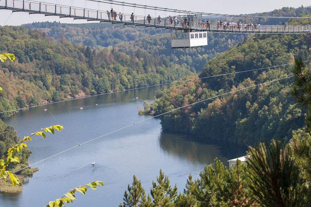 Een 485,5 meter lange hangbrug die een mooi uitzicht geven over de rivier de Bode en aan de andere kant de stuwdam.