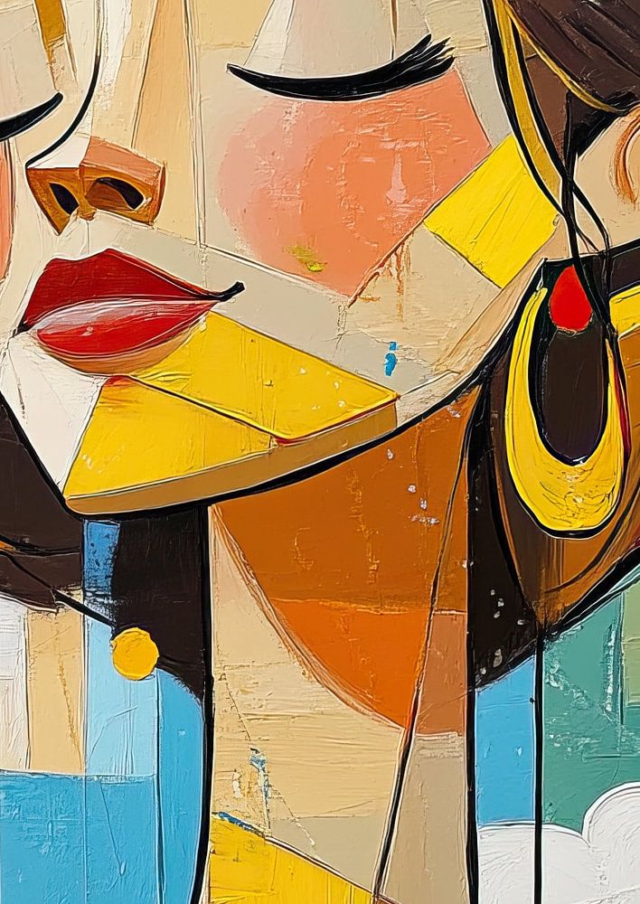 Détails : peinture moderne, portrait de femme, art abstrait, art moderne, art du visage, peinture colorée, portrait stylisé, motif géométrique, collection d'art, beauté féminine