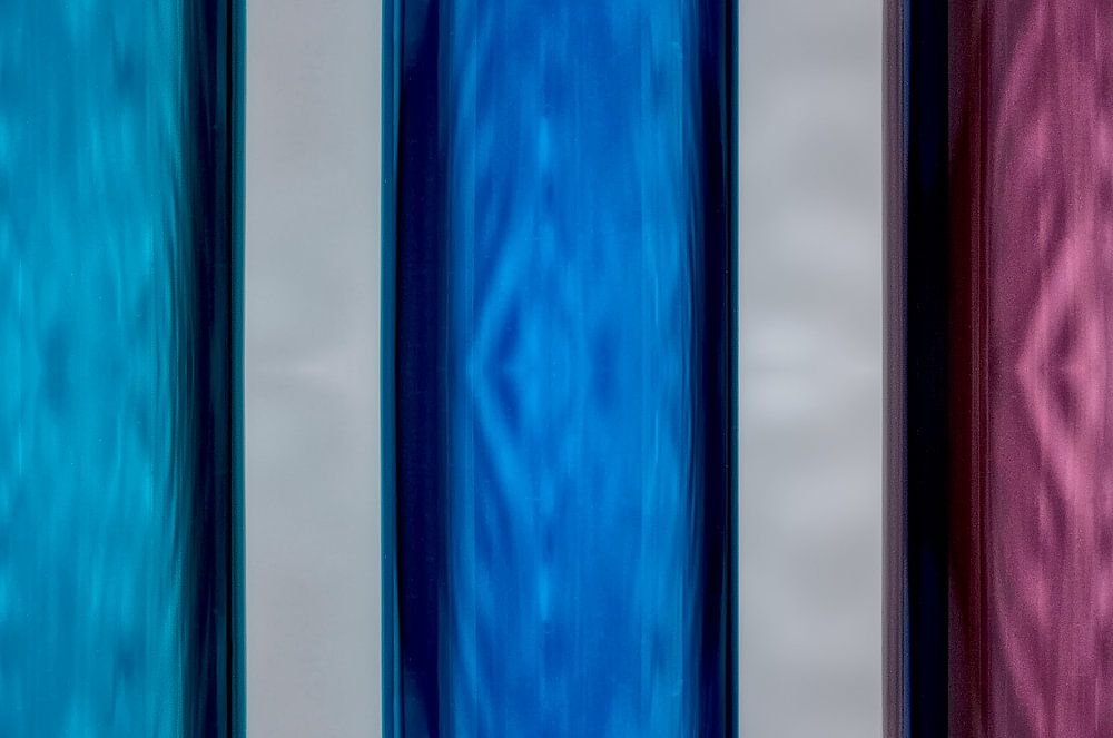 Trois cylindres de verre élancés contenant des liquides bleu vif et magenta, éclairés avec art pour faire ressortir une dynamique de couleurs vives et la transparence. La disposition symétrique sur un fond neutre crée une esthétique élégante et moderne, idéale pour la présentation de concepts innovants dans les domaines du design, de la chimie ou des cosmétiques.