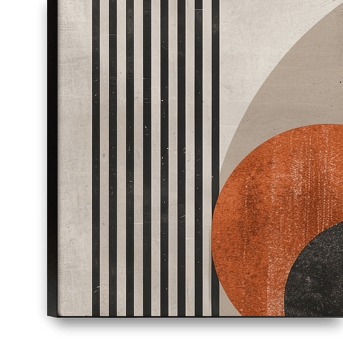 L'image montre une composition de formes géométriques de différentes couleurs. On y voit de grands cercles colorés en noir, orange et beige, combinés à des rayures verticales. L'arrière-plan est neutre, ce qui fait ressortir les formes. La composition semble moderne et abstraite, avec un jeu harmonieux de couleurs et de formes.