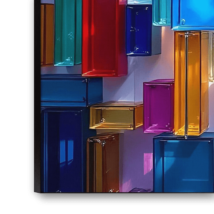 Les effets de verre sont conçus de manière à créer une certaine profondeur et une dimension. Les transitions douces entre les différents éléments créent une impression de fluidité, tandis que les accents lumineux dégagent énergie et créativité. L'image donne une sensation de légèreté et d'élégance, idéale pour toute pièce qui souhaite créer un environnement inspirant.