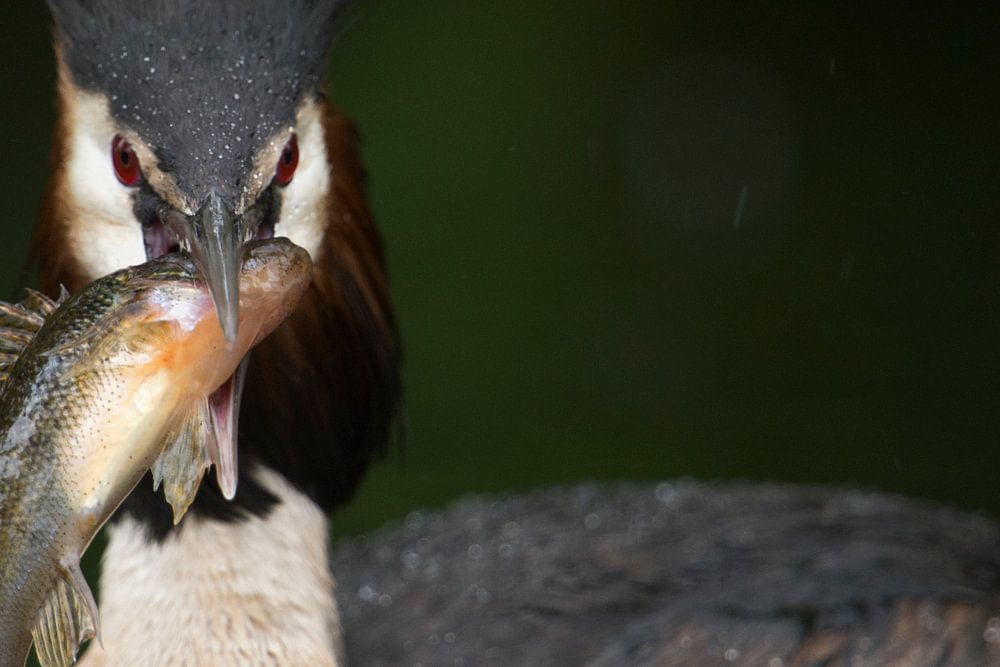 Haubentaucher ( Podiceps cristatus ), Altvogel, detaillierte Nahaufnahme, mit einem dicken Fisch (Barsch) im Schnabel, präsentiert erfolgreich und stolz seine Beute, wildlife, Europa