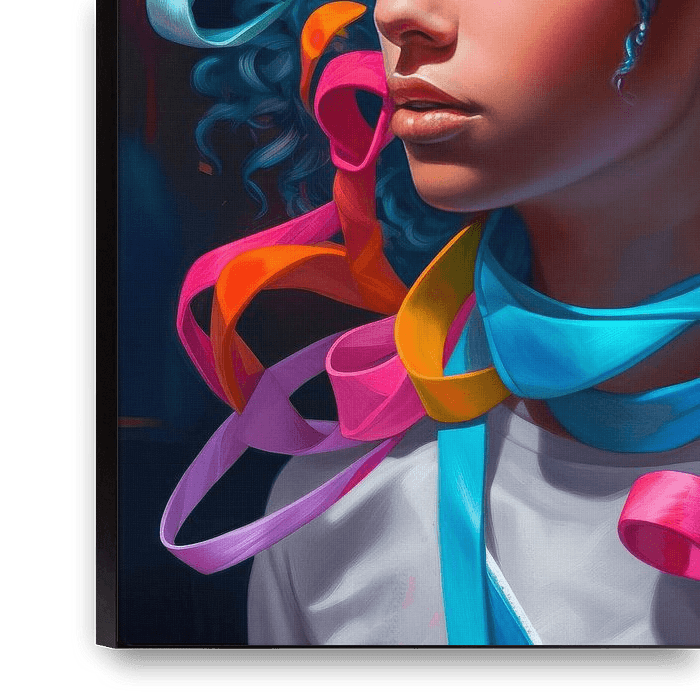 Le portrait de la jeune femme est une célébration vibrante de couleurs modernes, qui dépeint magnifiquement son apparence juvénile et sa nature enjouée. Sa peau est éclatante et les teintes vives de l'image mettent en valeur ses yeux pétillants, qui semblent cacher un monde de créativité et d'imagination. Ses cheveux, soigneusement…