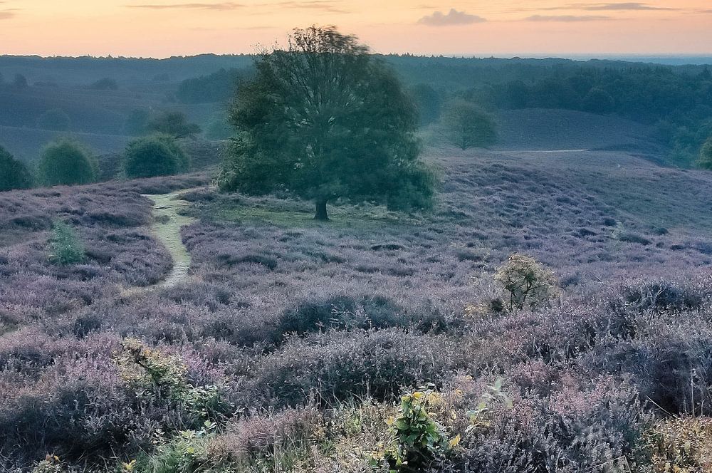 Bruyère en fleurs sur la Posbank près d'Arnhem au lever du soleil.