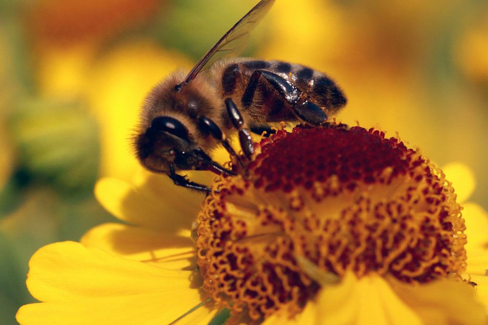 Fleurs de Helenium jaunes avec abeille, une image réelle de l'été. La chaleur du soleil et le bourdonnement des insectes volants. Fleurs riches en nectar plein de vie et de belles couleurs, se balançant dans une brise légère.