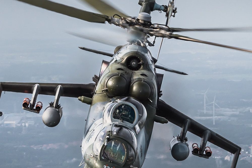 Le Mil Mi-24 (nom de code OTAN : Hind) est un grand hélicoptère de combat russe qui peut également transporter un petit nombre de militaires. Ses versions d'exportation sont le Mi-25 et le Mi-35. Il est en service dans l'armée de l'air soviétique (et ses successeurs) depuis 1976. Le Hind peut être utilisé pour l'appui aérien rapproché, les missions antichars et le combat aérien. Le fuselage est fortement blindé et les pales de rotor en titane peuvent résister aux impacts de balles de 12,7 mm. Le cockpit est pressurisé pour protéger l'équipage dans des conditions NBC. L'hélicoptère est équipé d'un train d'atterrissage rétractable en trois parties.