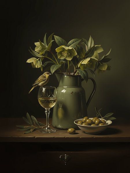 « Helleboris et vin » est un tableau serein issu de la collection « Oiseaux et fleurs », inspiré de la tradition picturale hollandaise du XVIIe siècle, où la simplicité, la lumière et l'équilibre occupent une place centrale. La composition est minimaliste et spacieuse, avec beaucoup d'espace négatif et un éclairage doux et subtil qui confère à l'ensemble une atmosphère paisible, presque méditative. Au centre se trouve généralement un petit vase raffiné en porcelaine, en faïence ou en verre, parfois complété par une coupelle de fruits ou quelques fruits isolés disposés avec désinvolture. Un ou deux oiseaux ajoutent une touche vivante mais discrète et s’intègrent naturellement dans la composition sereine. Chaque élément est travaillé avec soin, en accordant une attention particulière à la texture, au matériau et à la manière dont la lumière tombe doucement sur les formes. L’utilisation des couleurs varie d’une œuvre à l’autre, mais reste toujours harmonieuse et construite en ton sur ton, créant ainsi une atmosphère calme et équilibrée. Le fond est uniforme et se fond harmonieusement dans la surface, sans distraction, de sorte que l'attention se concentre entièrement sur l'interaction subtile entre les objets. Au sein de la série, les combinaisons de fleurs, d'oiseaux et de couleurs varient, mais l'essence reste la même : une nature morte raffinée où le calme, la simplicité et l'attention se rejoignent dans une image intemporelle et sobre.