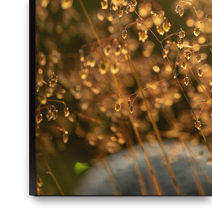 Herbe flottante dorée et lumineuse dans un jardin, le soir, à contre-jour. L'image séduit par son ton chaud et ses dégradés de couleurs dus au soleil.