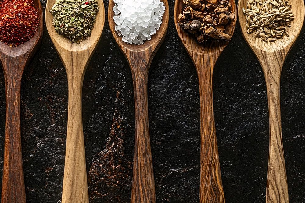 Cette belle image montre une collection de cuillères en bois remplies d'épices et d'herbes diverses, parfaites pour les amateurs de cuisine. Chaque cuillère contient un ingrédient différent, allant des feuilles séchées aux herbes colorées, qui créent ensemble une harmonie de tons et de textures naturels. Ce design est non seulement agréable à l'œil, mais il inspire également la créativité dans la cuisine. Parfait pour être suspendu dans la salle à manger ou la cuisine en guise de décoration, il apporte de la chaleur et une touche de charme rustique à l'espace. La combinaison de couleurs sombres et claires crée un contraste élégant, ce qui en fait une pièce unique pour tout intérieur.