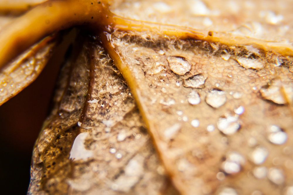 Macro foto van een blad in herfstlkeur met waterdruppels erop. Close-up van een typisch herfst tafereel!