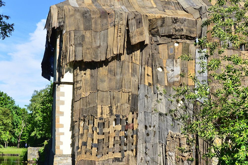 Schloss Strünkede in Herne. Als Kunstwerk mit Kohlensäcken verkleidet zum Ende des Bergbaus in diesem Jahr