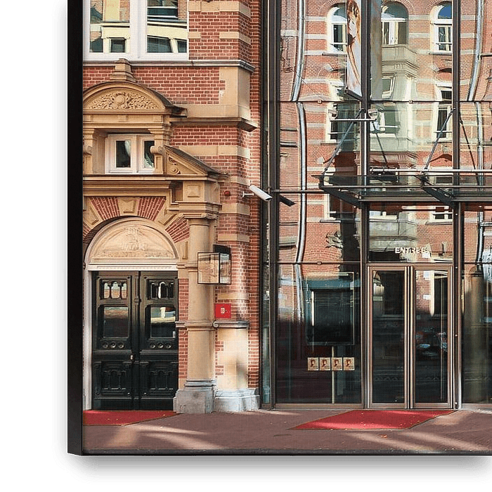Prachtige opname van de ingang van het DeLaMar theater in Amsterdam met reflectie van de gebouwen in de ruiten