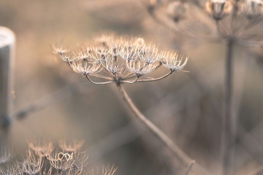 Gros plan d'une berce du Caucase dans la lumière dorée du soleil levant. Les températures glaciales font que la plante est recouverte d'une couche de givre.