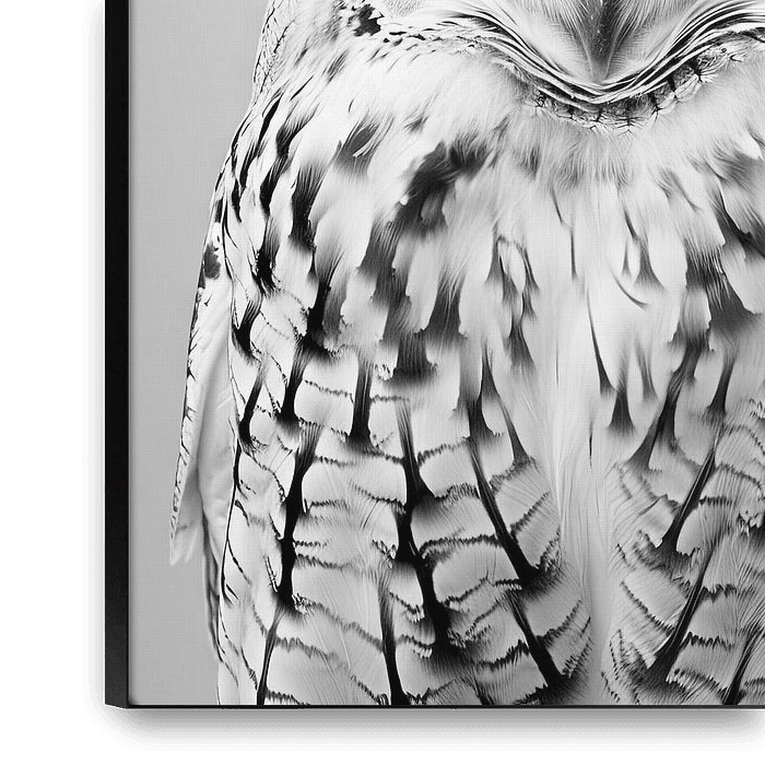 Cette image montre un gros plan détaillé d'une chouette en noir et blancẞ. La texture de son plumage et ses yeux expressifs sont fascinants.