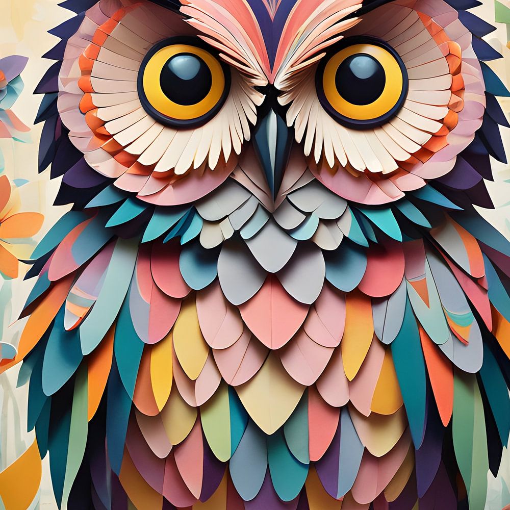 Cette œuvre d'art représente un hibou orné entouré de papillons et de fleurs colorés, créés dans un style rappelant l'art du papier et le quilling. La texture détaillée des plumes et les couleurs vives des fleurs et des papillons lui donnent vie. La composition en couches crée une profondeur subtile, donnant l'impression que le hibou émerge de l'œuvre.