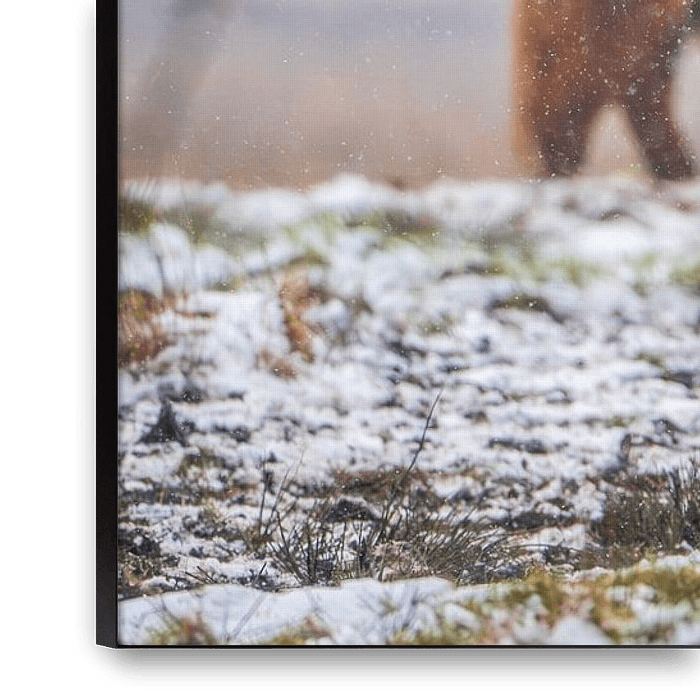 En hiver, la lande de Drenthe se transforme en un paysage paisible, presque féérique. Une fine couche de givre ou de neige recouvre la bruyère violette, tandis que le vent souffle librement sur la plaine ouverte. Parmi ces teintes froides, le pelage rugueux et roux des bovins Highland écossais offre un contraste chaleureux.