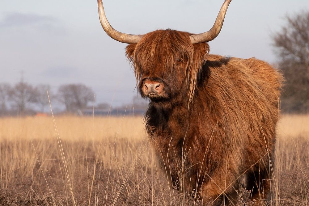 Un majestueux Highlander écossais se tient tranquillement dans une vaste lande sèche sous un ciel d'hiver bleu clair. Sa fourrure chaude, d'un brun rougeâtre, se détache magnifiquement de l'herbe pâle et des tons froids de l'arrière-plan. Les cornes imposantes de l'animal et sa posture apaisante dégagent force et sérénité. Au loin, le paysage s'estompe, renforçant l'impression de solitude et d'immensité de la campagne de Drenthe. La composition souligne le lien entre l'animal et la nature, dans un moment de pur silence.
