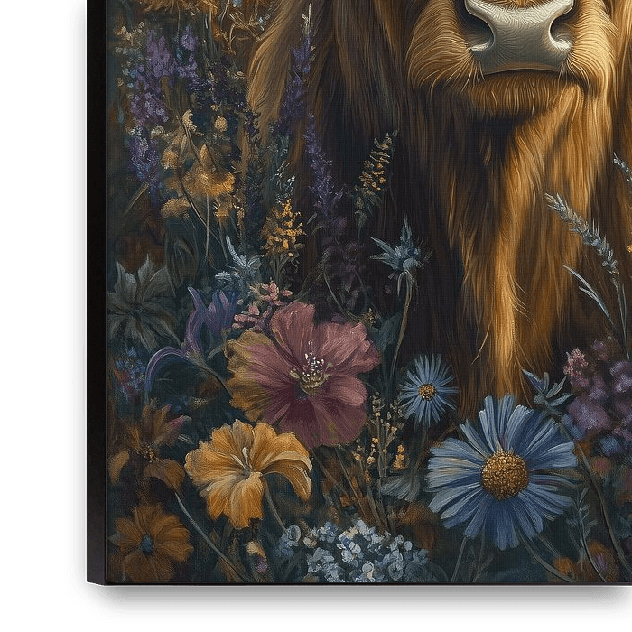 Cette composition enchanteresse montre un Highlander écossais portant une couronne florale luxuriante, entouré d'une explosion de fleurs colorées dans un cadre rustique. Les teintes chaudes du manteau sont magnifiquement complétées par le mélange vibrant de fleurs jaunes, violettes, bleues et roses. La texture détaillée de la crinière…