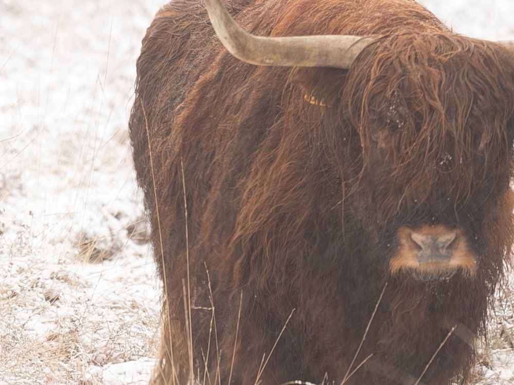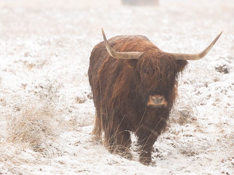 Ce magnifique bovin brun de race Highland m'est venu à la rencontre. La photo a été prise en janvier 2026 à Doldersum, dans la province de Drenthe, aux Pays-Bas. Une belle image hivernale.
