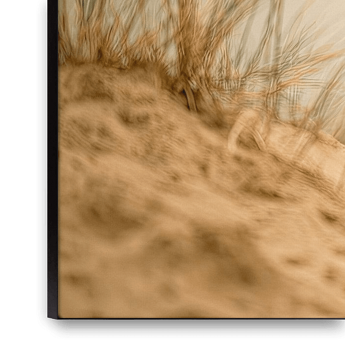 Le style est réaliste, avec des tons chauds. La composition est puissante grâce au placement central de l'animal. La palette de couleurs se compose de brun doré, de beige et de gris-vert. La photo utilise une lumière douce et une faible profondeur de champ, ce qui renforce l'attention portée à l'animal. Les couleurs s'harmonisent avec les tons terreux populaires dans les intérieurs contemporains.