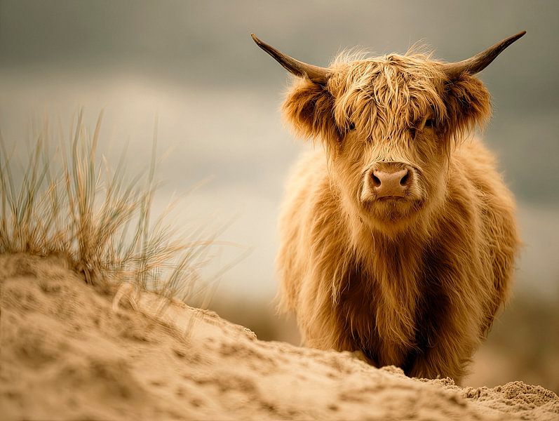 La photo montre un animal des Highlands dans le sable, photographié de face et légèrement en contre-plongée. Son pelage est long, hirsute et de couleur brun clair. La tête est légèrement inclinée, le regard est droit et calme. À droite de l'image, l'animal domine, à gauche, on aperçoit une dune de sable recouverte d'oyats. L'horizon s'estompe dans des tons doux, gris-bleu.