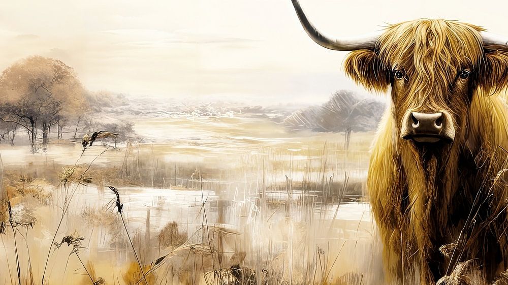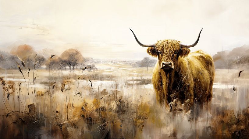 Un portrait inhabituel en format panoramique d'un Highlander écossais. L'animal de ferme familier se tient dans un paysage brumeux et automnal. Il regarde le spectateur en face. Le tableau est peint dans un style moderne et semi-abstrait.