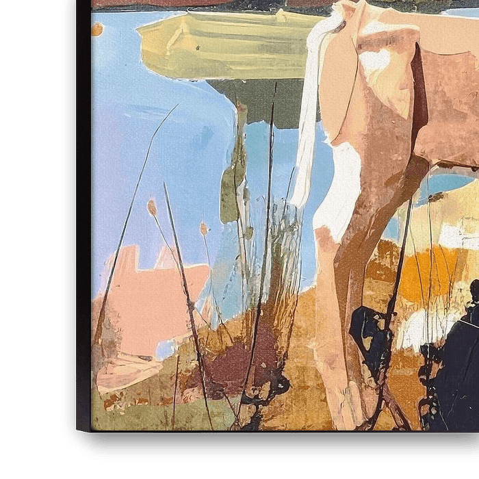 Une œuvre d'art figurative représentant un montagnard au bord d'un lac. Dans les couleurs rose, bleu, jaune et noir.