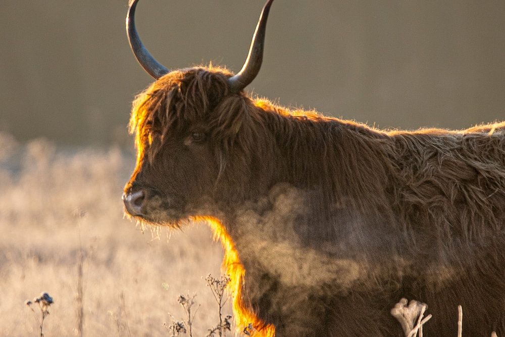 Highlander écossais dans le Raamdal au nord du Brabant. Après une nuit de gel, avec un magnifique lever de soleil et une heure dorée. Lueur dorée dans le pelage et rosée rayonnante dans l'herbe.