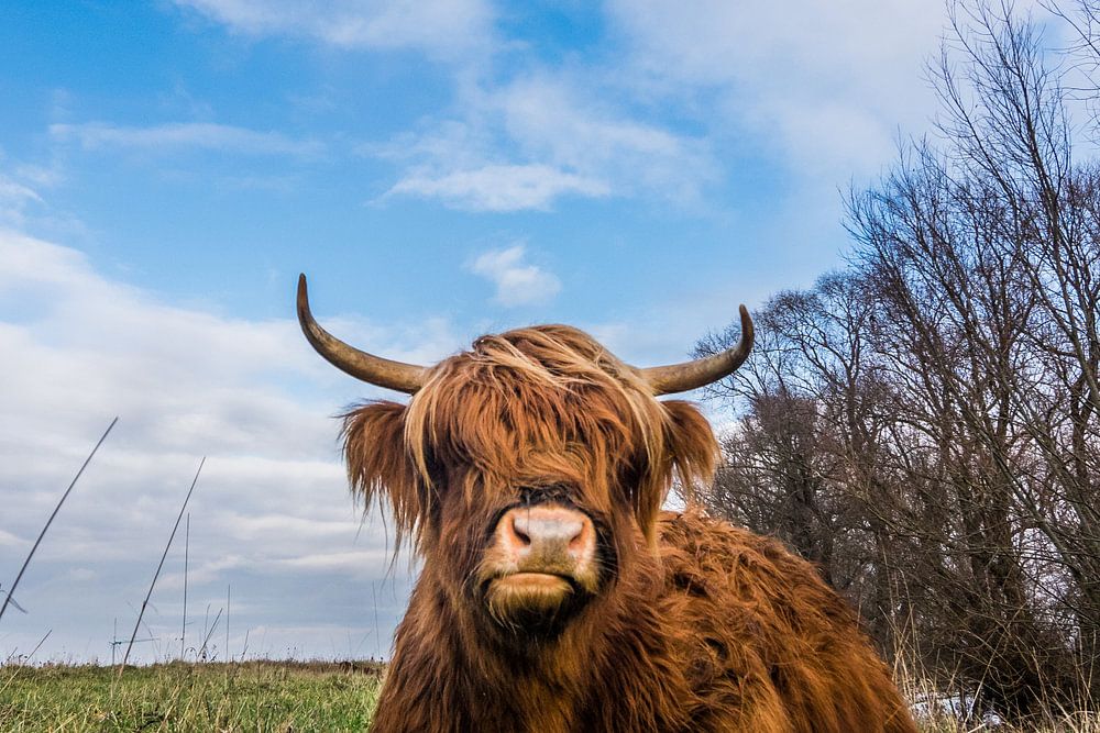 Le Highlander écossais rumine tranquillement. Charmant dans le champ vert, avec un ciel bleu délicieux
