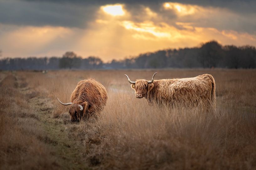 Par une froide journée à Hijkerveld, deux Highlanders écossais se déplacent dans l'herbe rude tandis que le soleil descend lentement vers l'horizon. Le soleil bas d'hiver perce la couverture nuageuse et projette de chauds rayons de lumière sur le paysage ouvert. Ce doux contre-jour contraste magnifiquement avec les tons terreux de l'herbe et le pelage épais et hirsute des Highlanders.