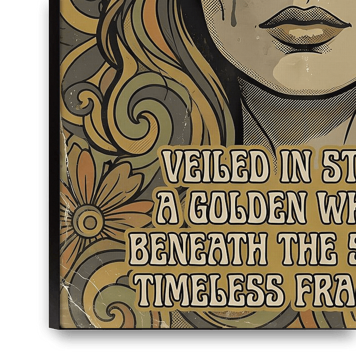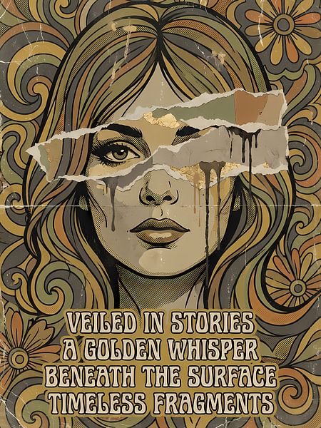 Cette œuvre d'art fascinante entraîne le spectateur dans un monde de profond mystère et de nostalgie évocatrice. Au cœur de l'œuvre se trouve le portrait saisissant d'une femme, dont le regard est à la fois direct et adouci par une narration visuelle unique. Sa chevelure fluide, composée de vagues organiques complexes et de motifs floraux, fait écho aux mouvements artistiques psychédéliques du passé, créant un mélange harmonieux entre la nature et la forme humaine. L'élément central est la déchirure artistique sur son visage, qui ressemble à un vieux papier déchiré révélant des fragments d'une histoire plus profonde. Au sein de ces couches, de subtiles lueurs de feuilles d'or apparaissent, symbolisant une valeur cachée ou des souvenirs précieux au milieu de ce qui pourrait apparaître comme une vulnérabilité, soulignée par de délicates coulures sombres qui évoquent un sentiment d'émotion passée ou de transformation. L'ensemble de la composition est imprégné d'une palette riche et terreuse de verts sourds, de bruns chauds et de jaunes dorés, encore rehaussée par une texture d'affiche vintage vieillie et des motifs de points en demi-teinte, lui donnant l'aspect d'une relique précieusement conservée. Cette pièce inspire l'introspection, invitant à la contemplation des histoires personnelles et de la beauté durable que l'on trouve sous la surface. Elle évoque une atmosphère chaleureuse et contemplative, parfaite pour un intérieur à la recherche d'un point focal qui raconte une histoire, résonne avec un esprit bohème ou complète une esthétique rétro soignée.