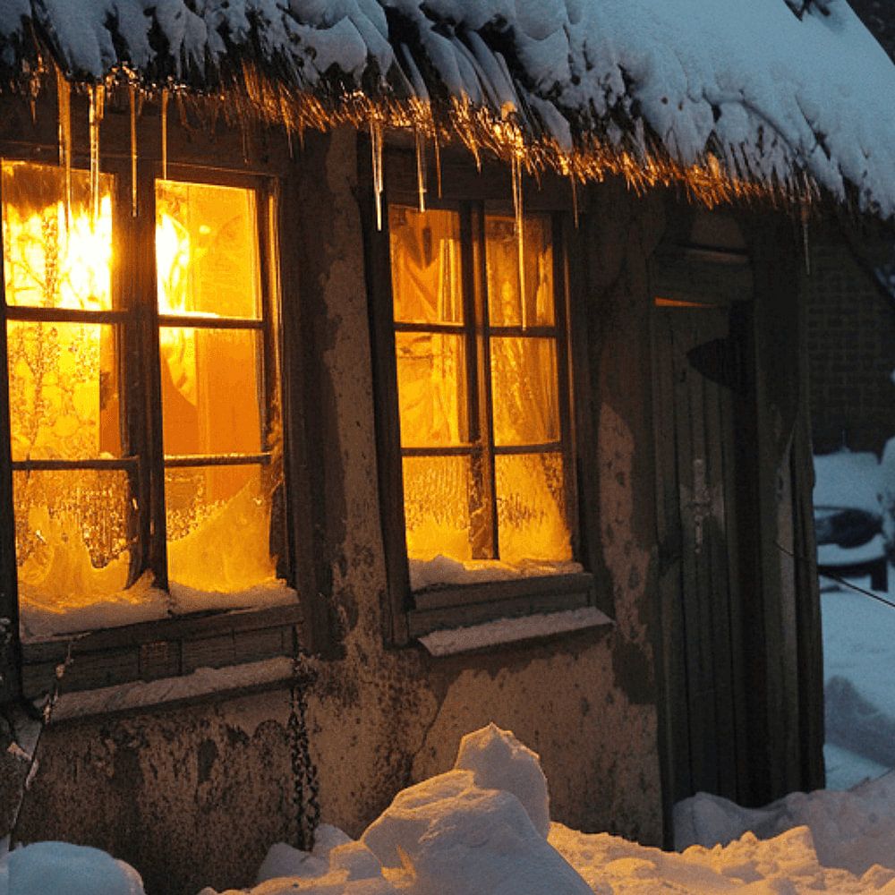 Une petite maison enneigée respire la sécurité chaleureuse, alors que dehors règne le froid du crépuscule hivernal. La lumière dorée derrière les fenêtres givrées scintille comme une promesse silencieuse de chaleur, de refuge et d'histoires au coin du feu. Le silence glacial et le confort douillet se rencontrent dans cette image et créent une atmosphère pleine de nostalgie et de magie.
