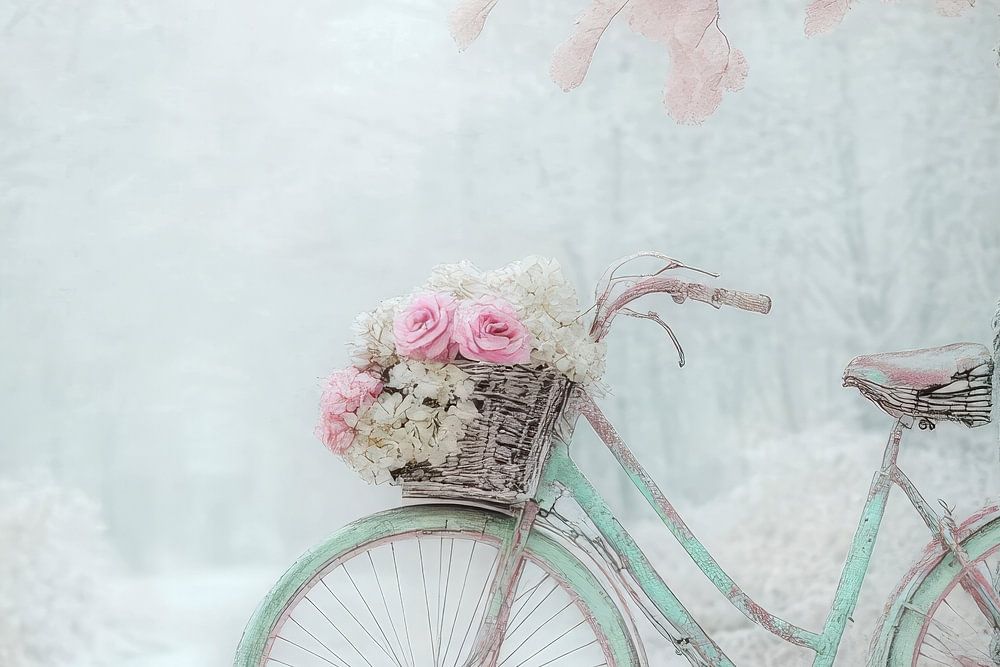 Image d'un paysage hivernal, avec un vieux vélo turquoise adossé à un arbre enneigé. Les environs sont recouverts d'une épaisse couche de neige, pour une atmosphère de conte de fées. Les arbres et les buissons sont couverts de givre et le ciel a un aspect doux et brumeux. Les couleurs de l'image sont principalement des tons pastel doux tels que le rose pâle, le blanc et le turquoise.