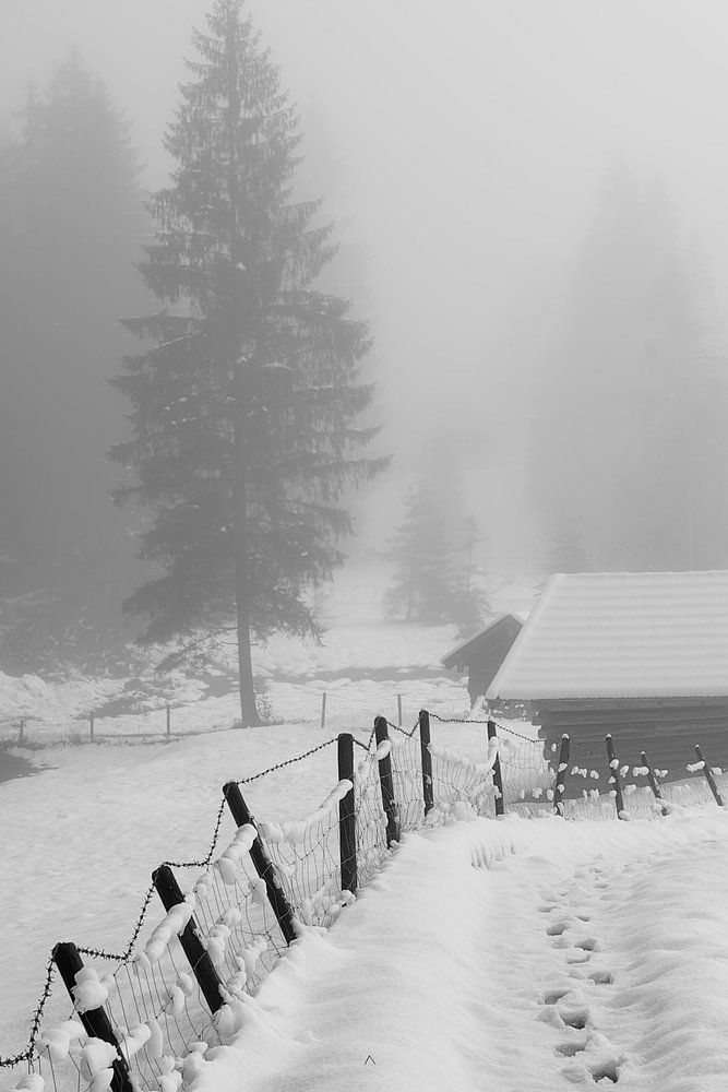 Countryside road to old wooden hut in foggy snowy day. Bavarian Alps, Germany. In black and white