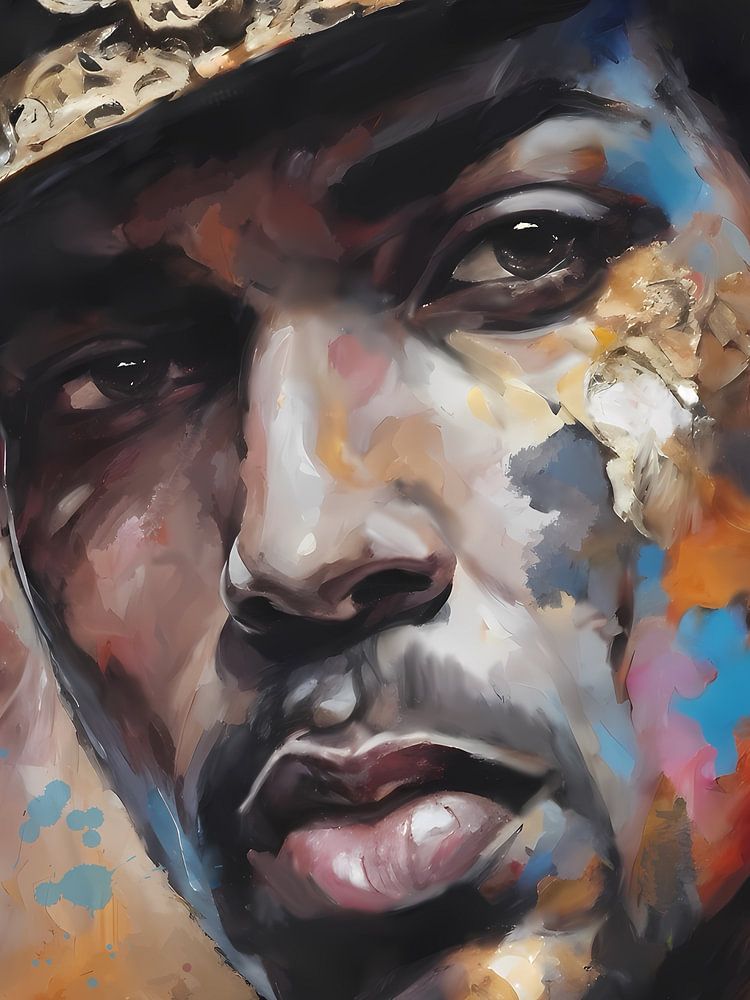 Portrait d'un homme élégant et coloré avec une casquette surmontée d'or. Élégant, moderne, stylé, avec les couleurs rouge, bleu orange, orange rouge, or rose.