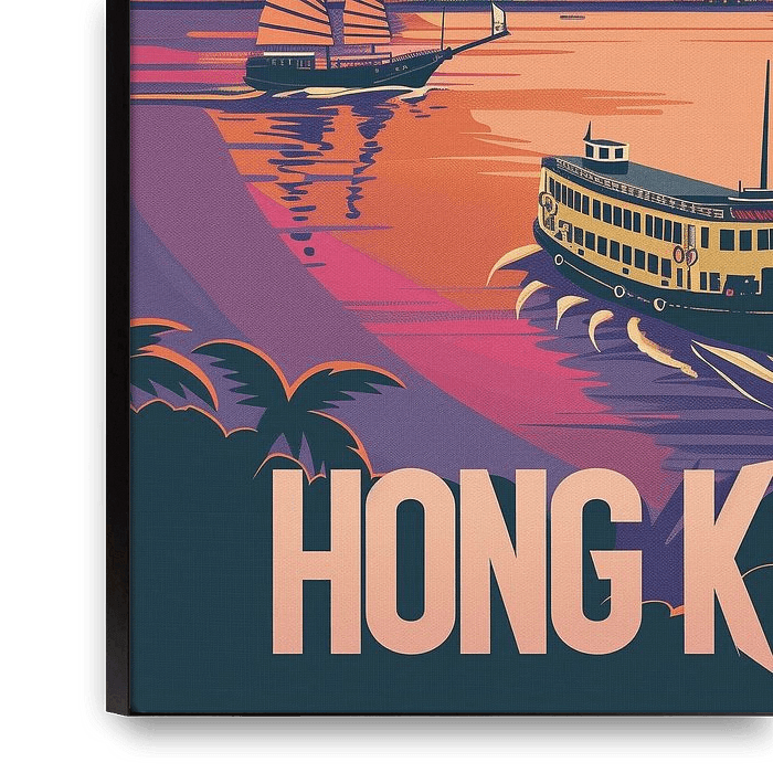Acheter ce illustration Hong Kong au crépuscule : Skyline &amp ; Star Ferry Retro Poster par Travel Shop sur toile, aluminium, ArtFrame ou photographie (encadrée), impression d'art en haute qualité et tout format.