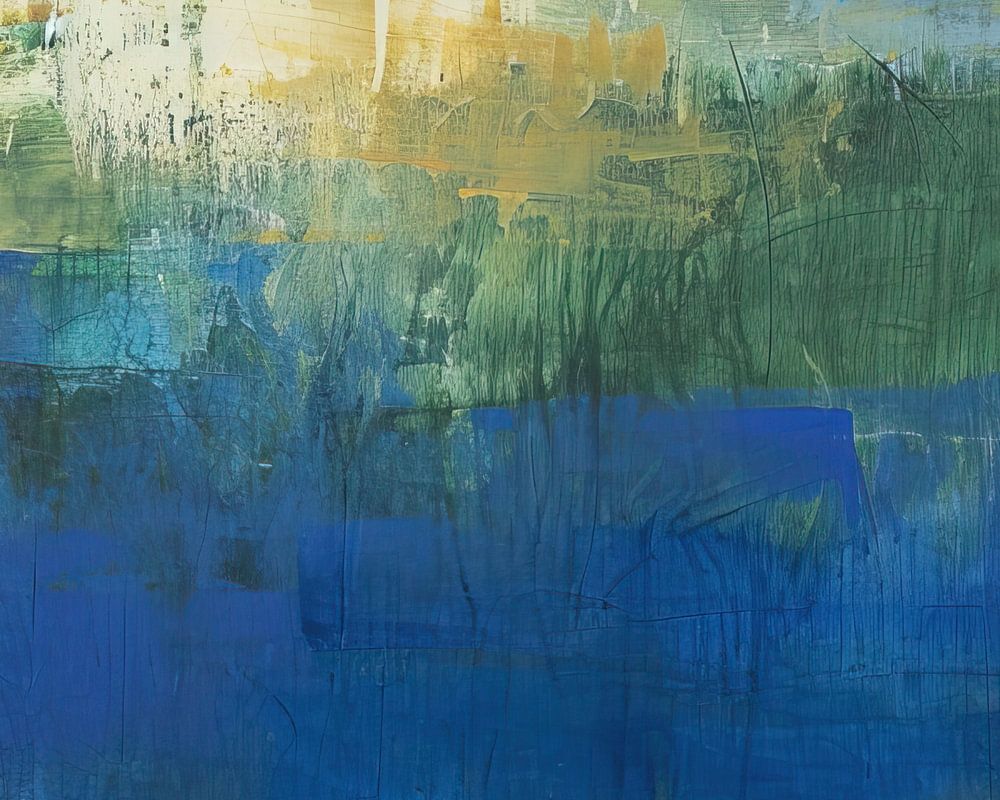 Détails : abstrait, paysage, moderne, bleu, or, vert, jaune, toile, horizontal, dynamique
