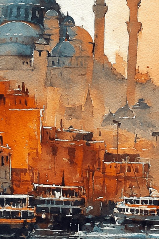 Baignée d'une lumière ambrée, cette aquarelle évocatrice capture la ligne d'horizon intemporelle d'Istanbul, où l'Orient rencontre l'Occident. La composition présente des dômes et des minarets s'élevant au-dessus du front de mer animé, leurs reflets scintillant sur le Bosphore. Des oiseaux s'élèvent dans le ciel doré, ajoutant une touche de mouvement et de liberté à cette scène paisible.