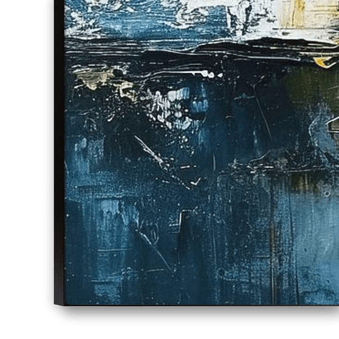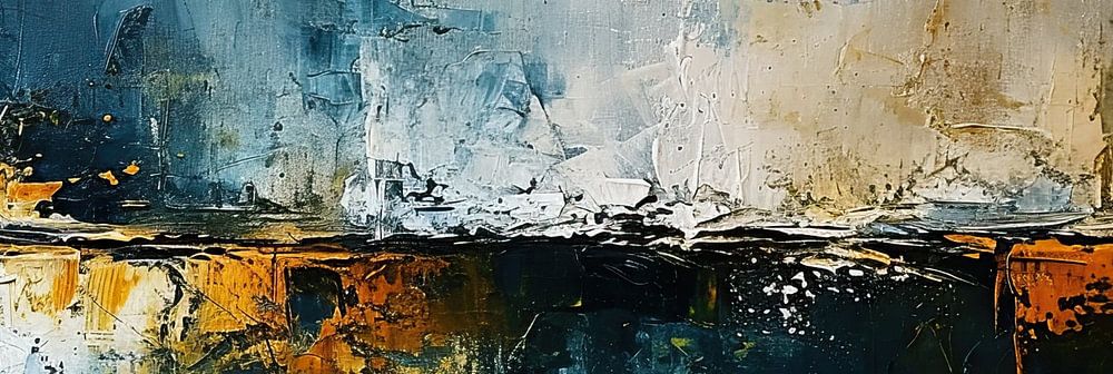 Horizon - Cette toile présente une expression abstraite dans laquelle les tons bleus et grisâtres enivrants mènent le jeu, ponctués par une bande d'accents chauds, dorés et orangés qui font office de ligne d'horizon. L'application de peinture épaisse et texturée, avec des coups de pinceau visibles, confère à l'œuvre une dimension dynamique et presque tangible.
