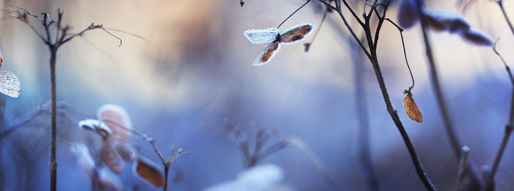 Photo macro panoramique composée de trois photos fusionnées. Feuilles d'hortensia gelées un jour d'hiver avec une lumière douce en arrière-plan.