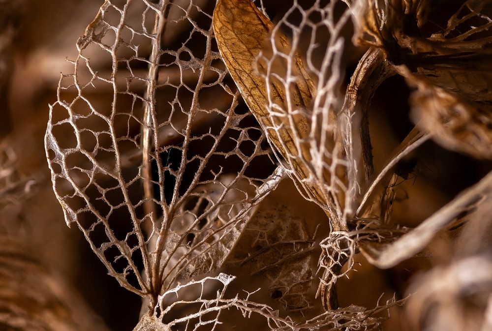 Hortentia stérile à la fin de l'automne. Photographié avec le 180mm macro et en empilant les photos. Cette photo est composée de pas moins de 40 clichés pour une netteté parfaite. Une belle macro d'automne pour une image pleine de détails sur le mur.