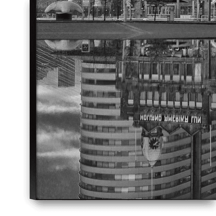 Zwart-wit foto van Hotel New York op de Kop van Zuid in Rotterdam, weerspiegeld in water op de kade van Katendrecht.