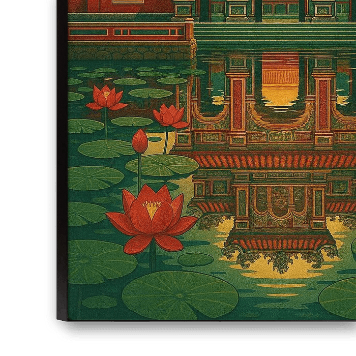 Cette œuvre d'art rend hommage à la beauté impériale et à la profondeur historique de Huế, l'ancienne capitale royale du Viêt Nam. La porte ancienne emblématique de la ville domine la composition. Elle est richement décorée de motifs traditionnels, de sculptures ornementales et de couleurs vives qui reflètent l'éclat architectural de la dynastie Nguyen. Le soleil levant derrière la structure illumine le ciel d'une lumière chaude et dorée, symbolisant le renouveau, la fierté culturelle et l'élégance intemporelle.