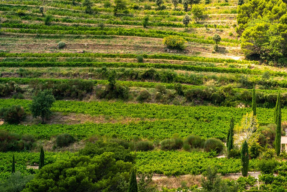 Dit huis midden in de wijngaard staat in het prachtige gebied van Dentelles de montmirail, Frnakrijk. Je loopt hier prachtig tussen de wijngaarden en bergen met het mooiste uitzicht. Een prachtig stukje van zuid Frankrijk. Het zonlicht scheen prachtig op het laatste stukje van de heuvel.