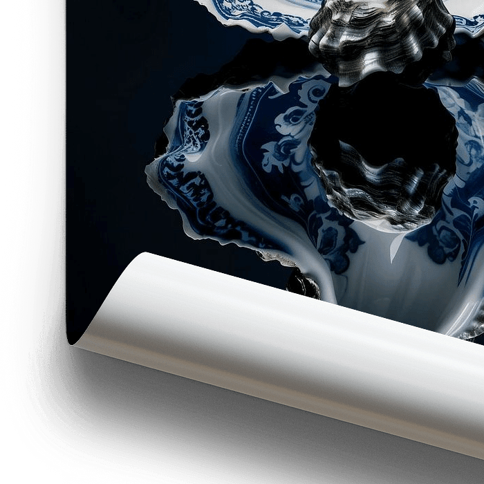 Une huître en faïence de Delft dans une composition symétrique sur un fond sombre.