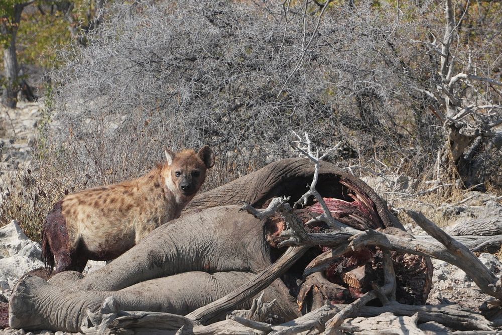 Hyène en train de manger. Carcasse d'éléphant.