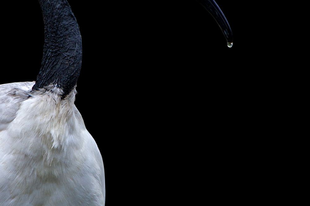 En les éclairant et en les isolant, les animaux s'expriment de manière évidente. Le cou et la tête ont un caprice excentrique. Cet ibis à tête noire a (comme "bonus") une autre goutte accrochée au bout de son bec.